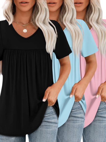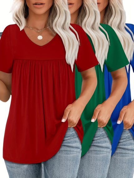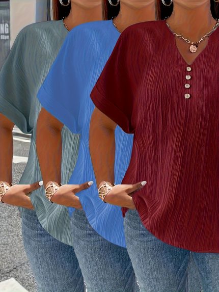 Plus Size – Plus Size – Set of Three Stylish Solid Color Short-Sleeve V-Neck Tops with Pleats at The Chest in Plus Sizes