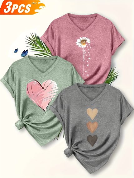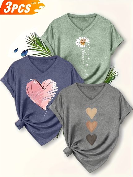 Plus Size – Plus Size – Versatile T-Shirt 3Pcss Set Plus Size Women’S Fashion Easy Elegant Floral Heart Pattern Printed Casual V-Neck T-Shirts 3Pcss Set, Soft And Non-Constricting Fabric, – Soft And Easy to Care For, Machine Washable
