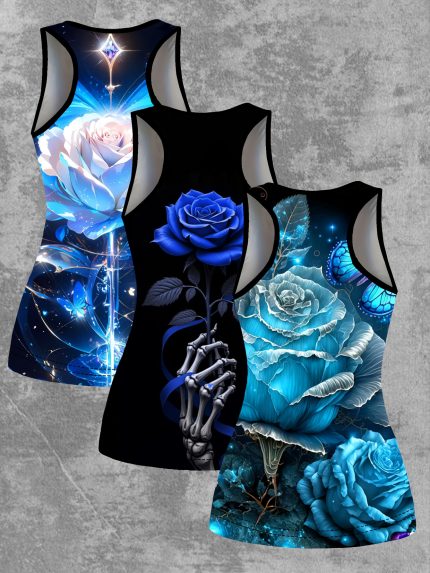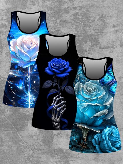 Set of 3 European And American Women’S Spring And Summer New Style Camisole Featuring a Digital Print of Blue Butterflies And Roses