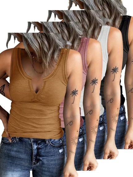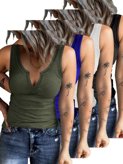 Set of 4 Women’S Summer Vests with a V-Neck, Made from Stretchy Ribbed Fabric, Suitable for Various Occasions