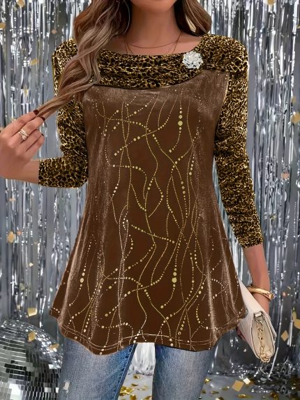 Plus Size, Women’s Plus Size Elegant Golden Velvet with Silvery Sprinkles, Leopard Print Mesh Patchwork, Shiny Flower Embellished Long Sleeve Top
