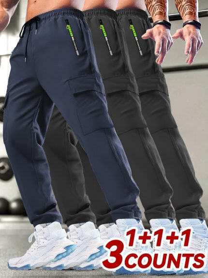 Set of 3 Men’S Casual Sports Cargo Pants with Drawstring Waist, Print Zip Pockets, Utility Pockets, Lightweight for Spring And Summer, Ideal for Outdoor Running And Training